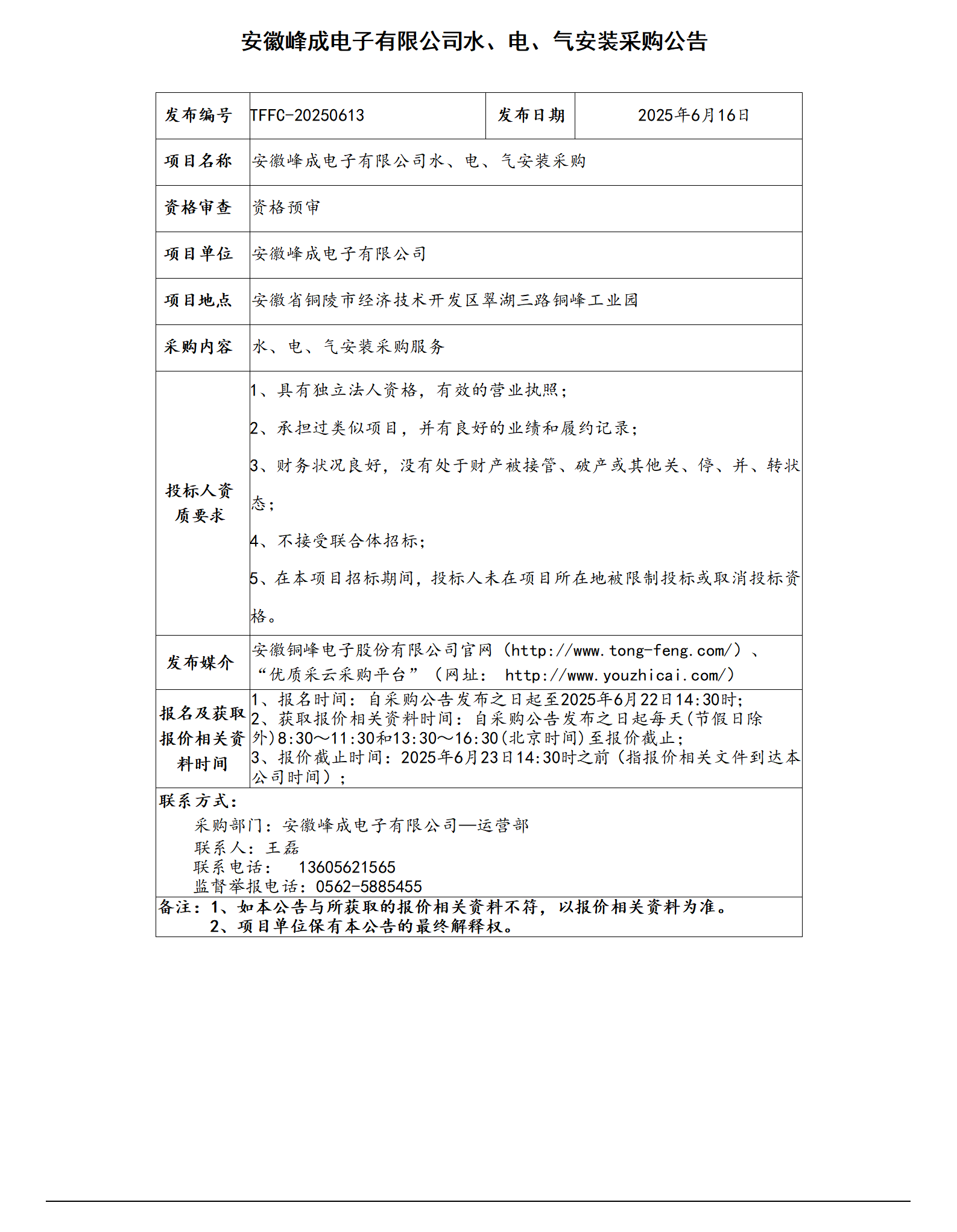 安徽峰成電子有限公司水、電、氣安裝采購公告_01