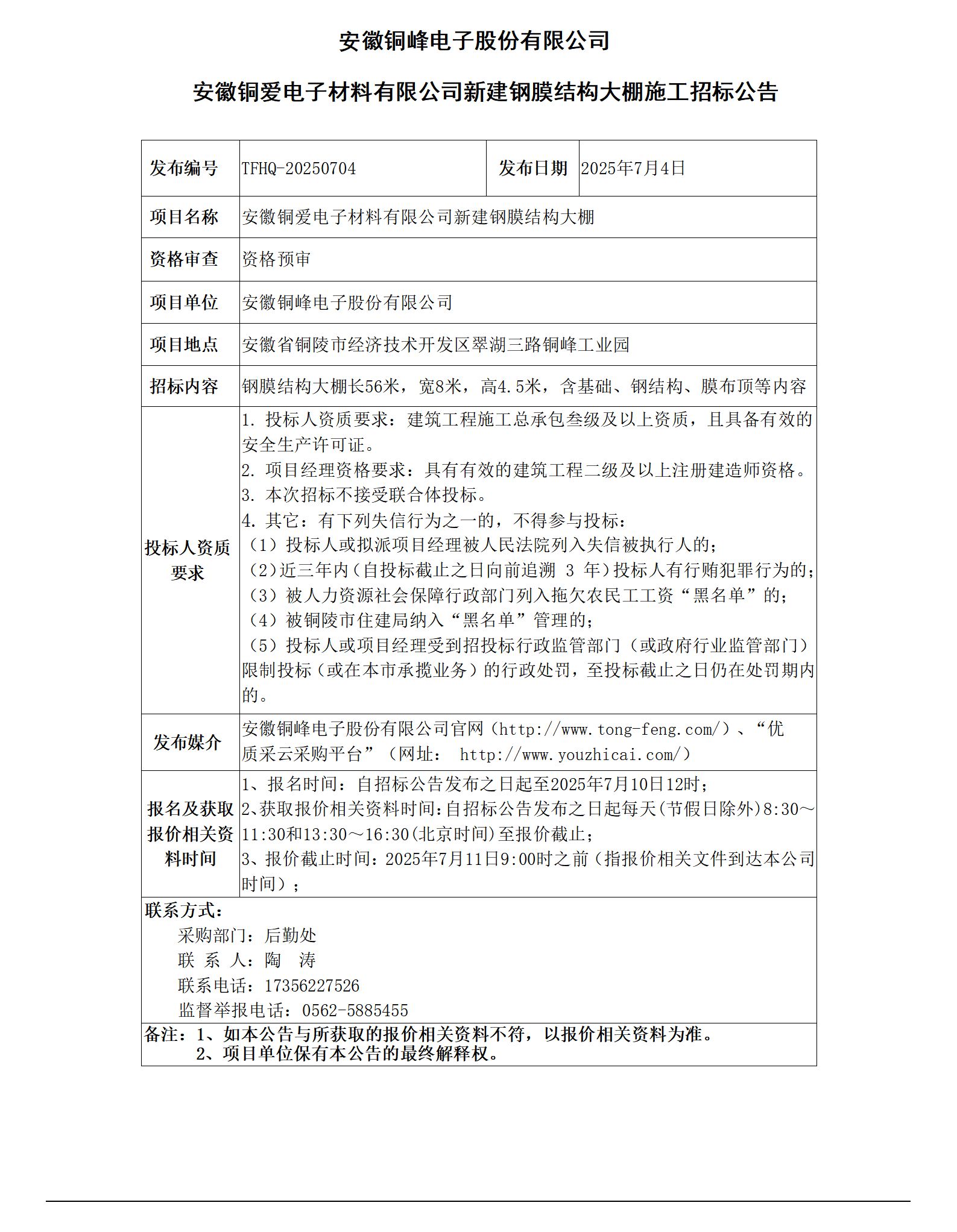 安徽銅峰電子股份有限公司 (安徽銅愛電子材料有限公司新建鋼膜結(jié)構(gòu)大棚招標公告)_01