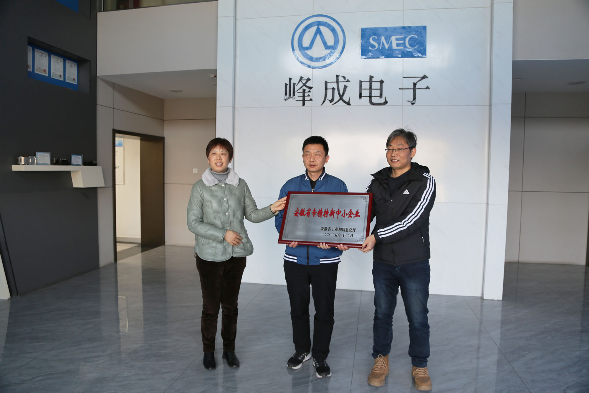 1月15日下午,市中小企業(yè)局副局長丁靜一行來峰成公司走訪調研,向峰成公司授予省專精特新中小企業(yè)榮譽牌匾,了解企業(yè)經(jīng)營發(fā)展、科技創(chuàng)新、品牌建設等情況,并宣傳相關惠企政策。