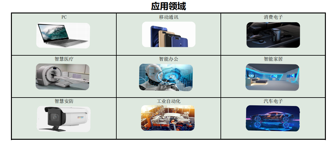 產(chǎn)品廣泛應(yīng)用于:3C(計(jì)算機(jī)、通訊、消費(fèi)電子)、智慧醫(yī)療、智能辦公、智能家居、智慧安防、物聯(lián)網(wǎng)、工業(yè)自動化及汽車電子等領(lǐng)域,靈活滿足全球不同客戶的差異化需求以及快速創(chuàng)新的追求。